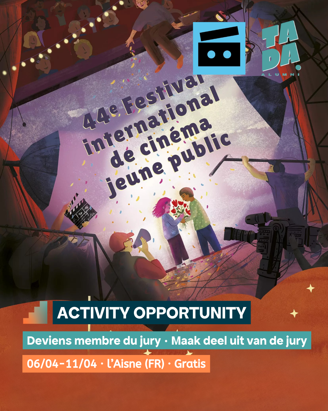 Toutes les opportunités TADA ALUMNI CENTER : Planning Février 2026 3 février - 25 février TADA ALUMNI CENTER : Travailler à la Police? Viens t’informer! 25 février @ 14:30 - 16:00 ALUMNI ACTIVITY : Visit behind the scenes of Dott @Anderlecht 4 mars @ 14:00 - 16:30 𝐓𝐑𝐀𝐈𝐍𝐈𝐍𝐆 𝐎𝐏𝐏𝐎𝐑𝐓𝐔𝐍𝐈𝐓𝐘: Boost your Talents programme 15 mars @ 00:00 TADA ALUMNI FESTIVAL 22 mars @ 13:30 - 17:30 ALUMNI FESTIVAL: HELP US! 22 mars @ 13:30 - 17:30 ACTIVITY OPPORTUNITY : Paroles de Jeunes @Mundo Madou, Bruxelles 3 avril - 5 avril 🤩 ACTIVITY OPPORTUNITY : Jury Jeune International @ Laon (France) 🤩 6 avril - 11 avril ACTIVITY OPPORTUNITY : Stage de théâtre en avril @Théâtre de la Vie 28 avril - 30 avril